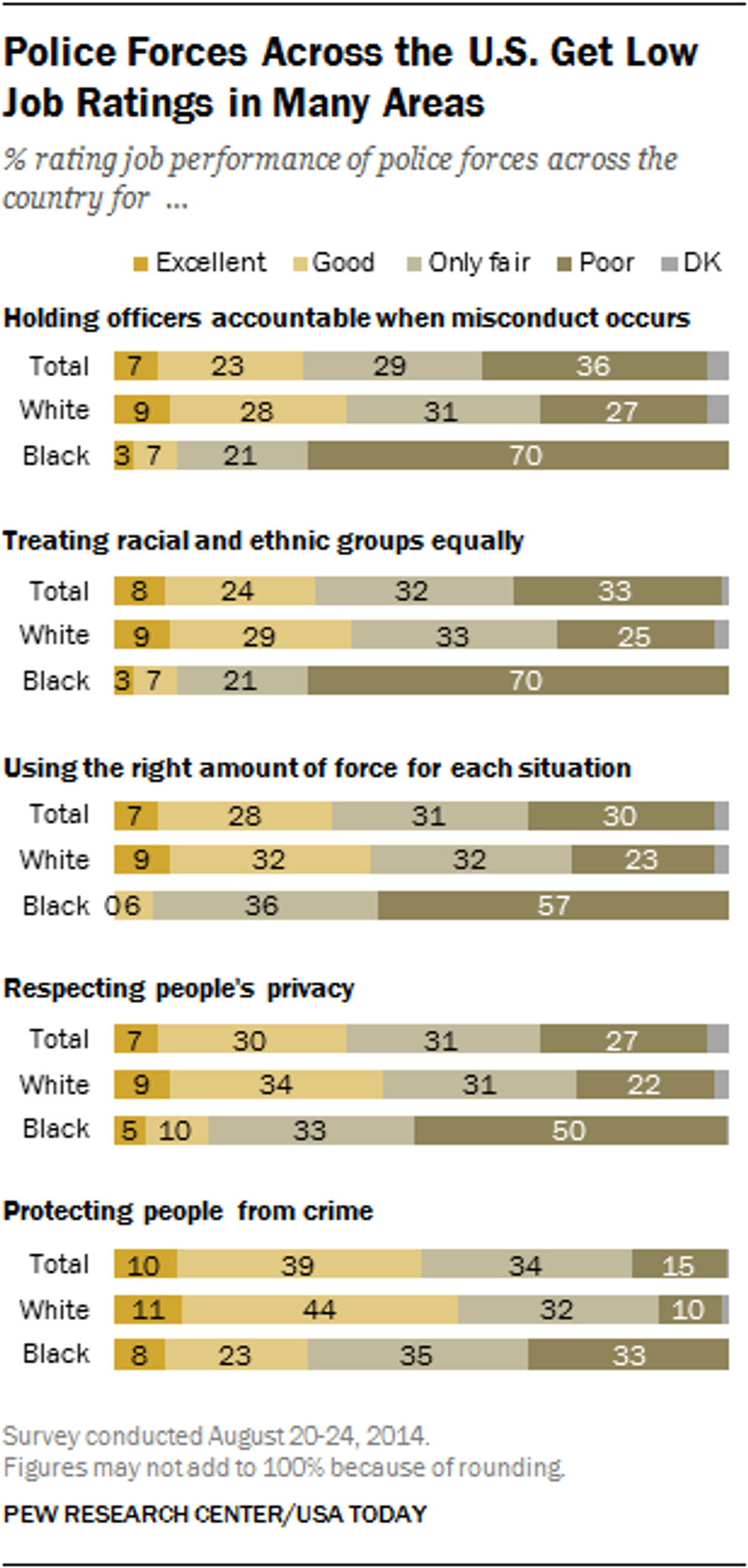 As a result of this treatment by the police, there is a deep distrust of law enforcement among blacks, especially when compared to whites. The data collected below shows a substantial difference between the level of confidence blacks and whites have for the police.