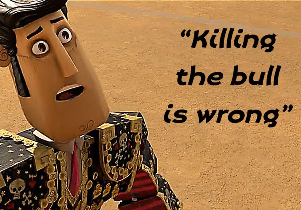 This movie was created by Jorge R. Gutierrez in the year 2014, It's based on cultural lookouts about mexico, specifically "The Day Of The Dead" aka Día de Muertos and the two main characters Manolo Sánchez and Joaquín Mondragon competing over María Posada. The movie itself is wonderful but there is one tiny detail that I love. Manolo was born into a family of bullfighters and he refuses to take part in his family's traditions. If you haven't seen the movie I won't spoil it for you, but I do recommend seeing it, The story and the animation is beautiful.