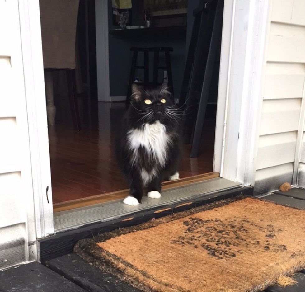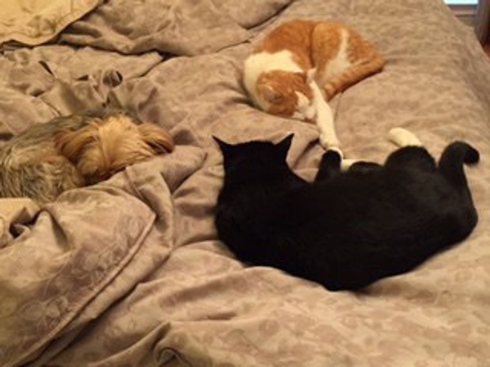 Every time I come home for a visit from school, my cats come running up to me, right behind the dog, to greet me with a "meow" and rub up against my legs while waiting for a pet.