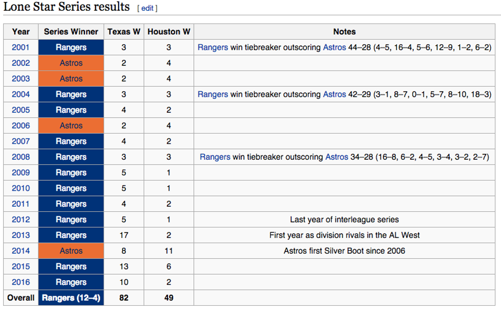 The Rangers have always dominated the Astros, and they have continued their dominance this season. Last season, the Rangers made a last-minute run at the playoffs, taking the division from the former first place Astros. As you can see, the Rangers have won all but four "Silver Boot" battles.