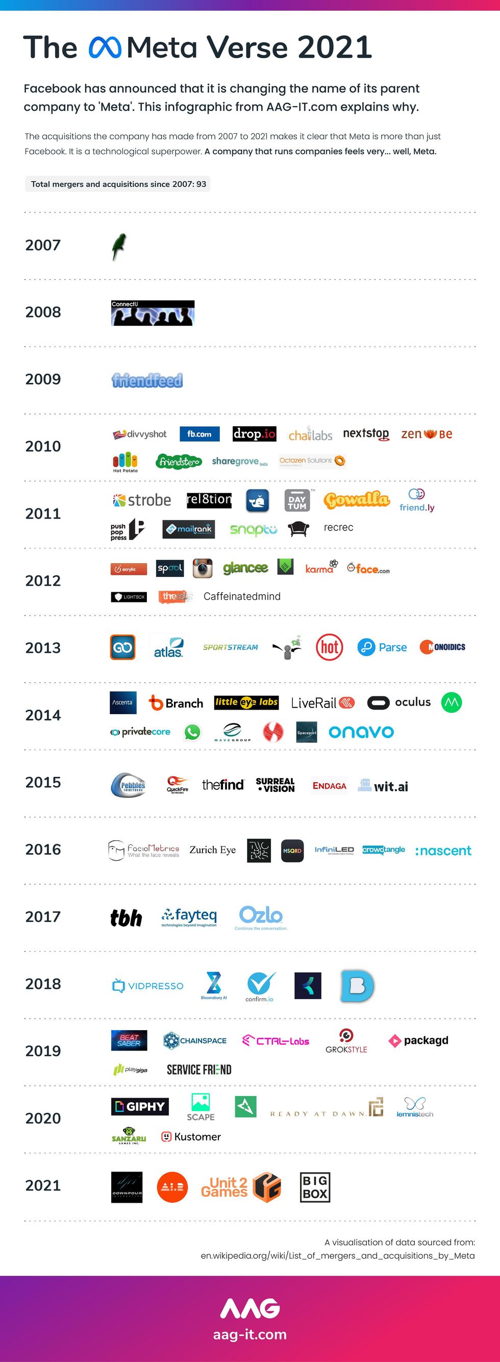 The parent company owns dozens of smaller entities. Most famously Instagram and Whatsapp, but also many technologies that help Meta to improve data processing and provide ground-breaking virtual reality and augmented reality services.