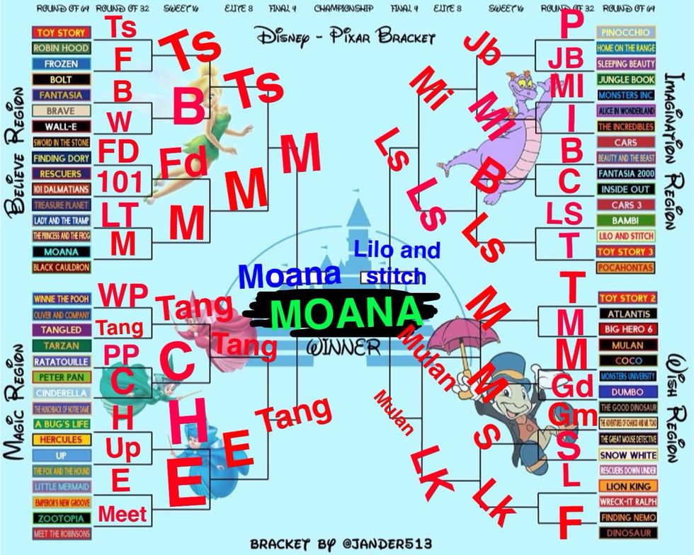 What I found to be the most difficult thing was the variety of movies that were on here. For example, older movies like "Beauty and the Beast" and "Lion King" are always such good go to's and are a huge part of my childhood. But then you have more recent movies such as "Frozen" and "Moana" that I also love so much. I almost feel as if there should be two separate brackets. One for older movies and one for more recent movies. The results would most likely be completely different. But for these purposes, I ended up choosing the more recent movie route vs the old school route.