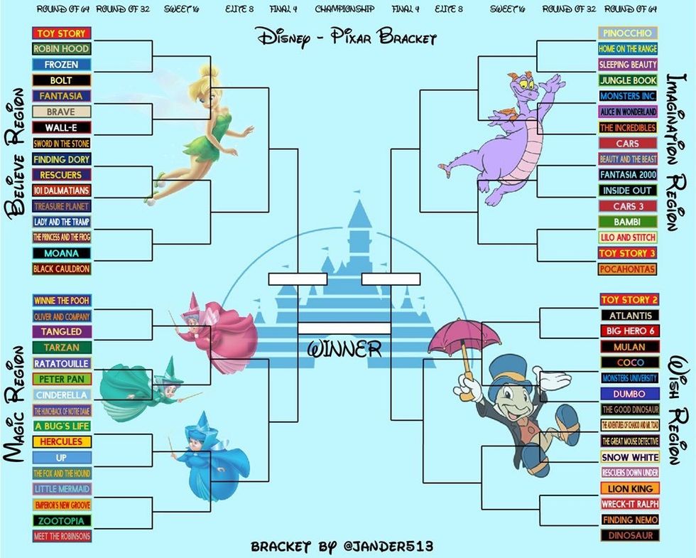 Disney Brackets are all the rage right now. You've seen it everywhere on the internet. And people are fighting like crazy about it. But it's just so hard to pick one movie! Disney movies are iconic! And there are so many ways to go about it. One of the beauties about this Disney Bracket is that it goes way back to prime old school Disney but also features the Disney of today. Although this is a beauty, it also makes the process so much harder! Here is my personal take on it. Go on ahead and make comments, but we all have different opinions! Let me explain.