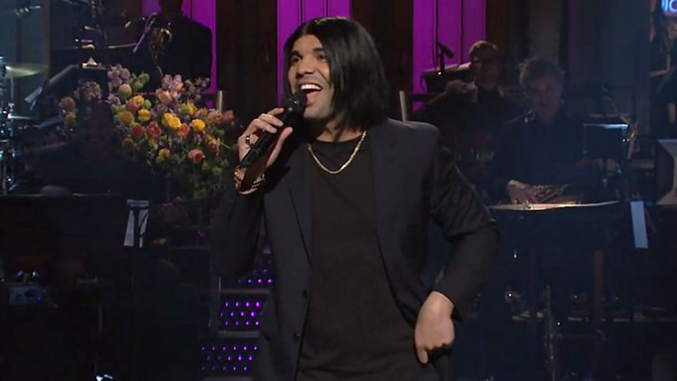 I'll tell you why, because Drake appeals not only to the fantasy of being the guy in the action movie on the "safe-house nights out in Calabasas" waiting for his enemies to come for him, but also to the desire to have all of that money and power and still be a regular human who likes to make jokes and speak in funny accents. The duality of Drake's image is what makes him so magnetic and also seemingly untouchable. You can't beat Drake because Drake will capitalize on his own weaknesses before you and poke fun at them himself. He is somehow simultaneously the guy who can brazenly rap "I hear fairytales bout how they gon' run up on me, well run up when you see me then and we gon' see" but then appear on Saturday Night Live to spoof his own feud with rapper Meek Mill. Drake essentially puts himself in check every so often in the eyes of the masses by appearing to not take himself so seriously. On songs he may sometimes paint the image of a man looking over his shoulders for hidden enemies far more dastardly than Meek Mill, saying that "the higher ups have all come together as a collective with conspiracies to end my run and send me a message", but then he'll put on a wig on late night television and impersonate his celebrity crush Rihanna singing her hit single "Work".