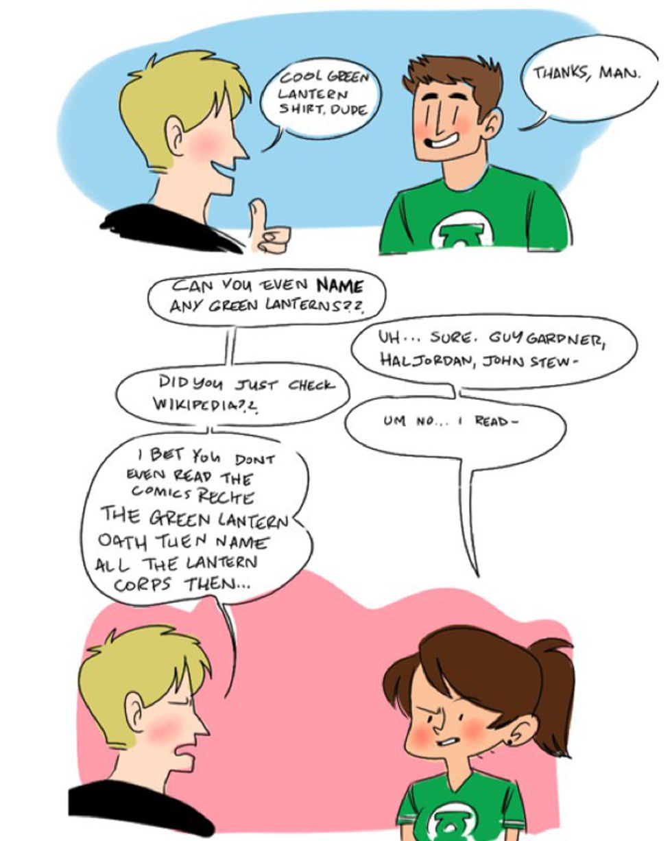 There is a strange mentality that girls liking things is not the same as guys liking things that exists in the world today. And that is what being a geek is. The definition of a geek is "a person who has excessive enthusiasm for and some expertise about a specialized subject or activity." (A nerd, in contrast, is defined as this: "an intelligent but single-minded person obsessed with a nonsocial hobby or pursuit." But they're used in the same contexts. Semantics.) There is nothing in that definition that says a geek has to be male. So why is there a gatekeeping mentality to men when it comes to girls who like stereotypically geeky things?