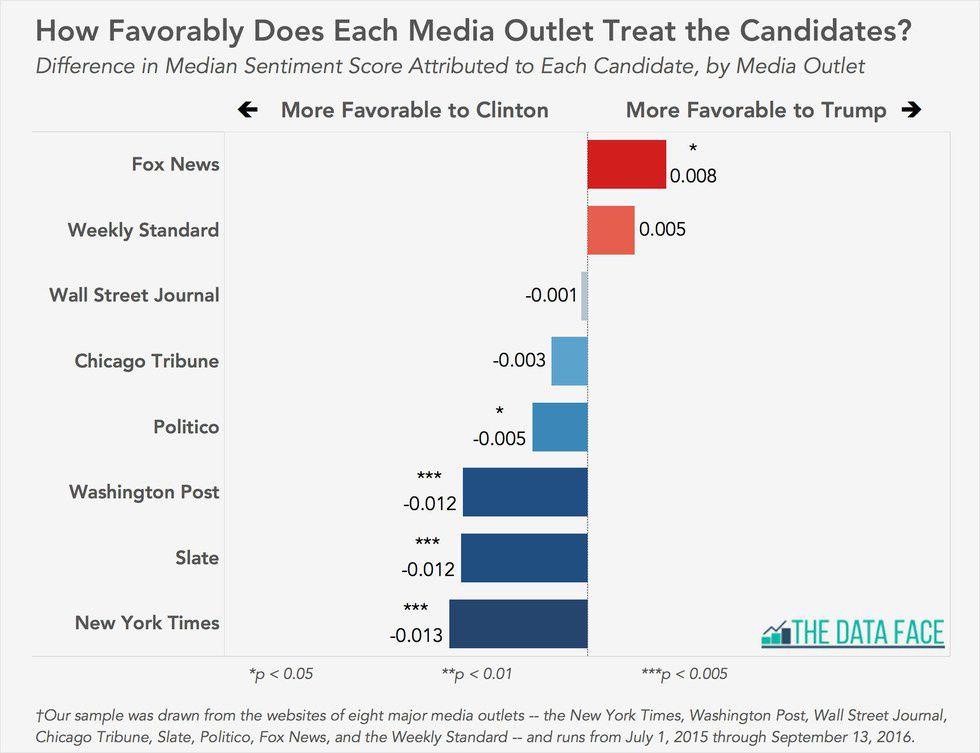 Along the lines of trustworthy news, it seems today that news has a bias towards informing individuals on what is true and what is not. News today defends or attacks politicians that news anchors deem as liars. News agencies with opposing viewpoints battle it out to reach the most viewers and align their political interests with whatever side they claim to be is most honest. The United State's latest election is a critical point for discussing media bias. "The Washington Post" compiled this infographic to display some of the United State's biggest media companies and their interpreted bias: