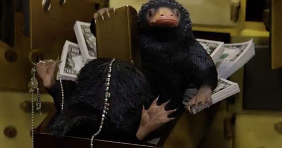 AWWWWWWWW. Oops, sorry. Anyway. Nifflers will make a ruckus in order to get their paws on anything shiny. And a ruckus is exactly what he creates. He tries to rob a bank before Newt catches up with him. While looking for him, Newt runs into a muggle, Jacob Kowalski, and he accidentally takes Newt's briefcase... a briefcase that happens to have many magical beasts in it. And two witches, Queenie and Tina, tag along to help him.