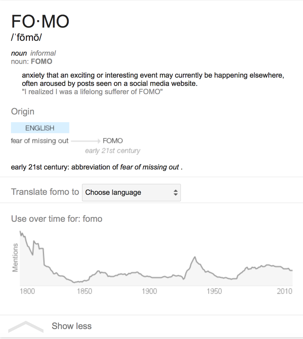 According to its Wikipedia page, FOMO is “a pervasive apprehension that others might be having rewarding experiences from which one is absent,” a sophisticated way of wording anxiety that an exciting event may be occurring elsewhere. The key words here are might and may; these modal verbs simply suggest possibility, though in the moment they seem definitive. Etymologically speaking, FoMO had an alarmingly high usage around 1800, though a quick search of Google Books suggests “fomo” back then was probably (definitely) defined differently.