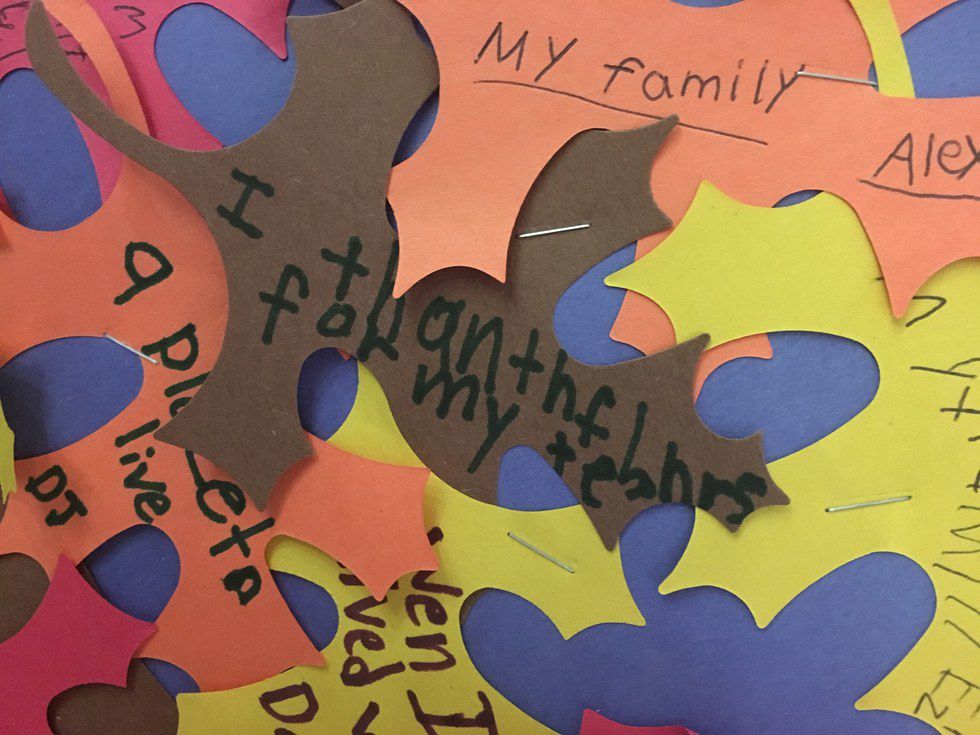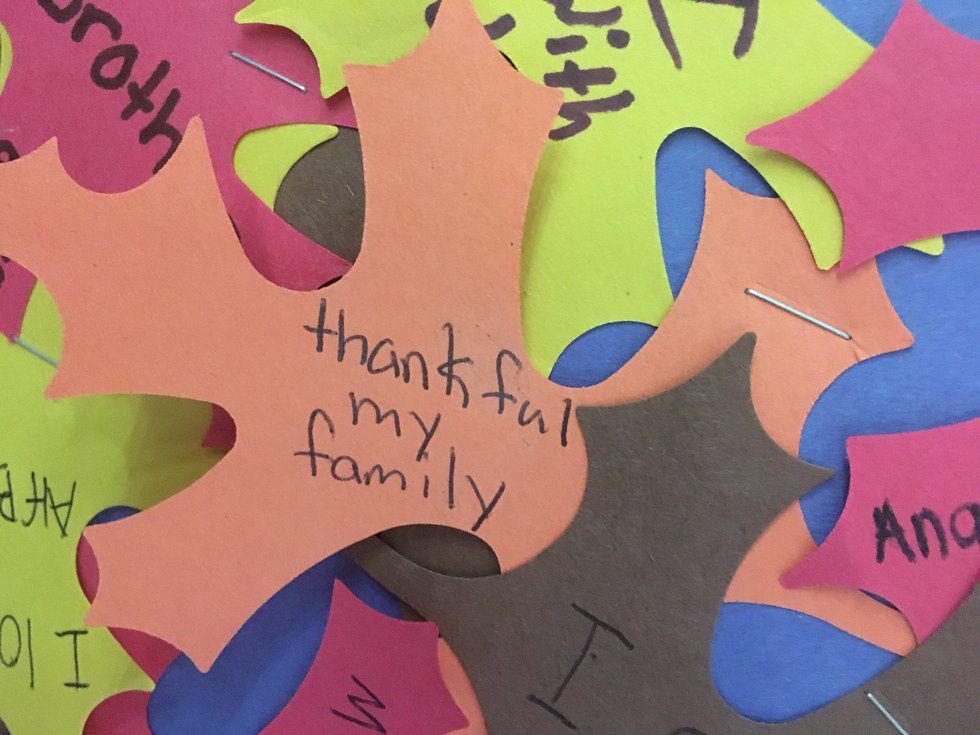 For the past few years I have implemented the idea of a “Thankful Tree” in my after school program. I cut leaves and create a bare tree trunk out of construction paper, and simply ask my students “what are you thankful for?”