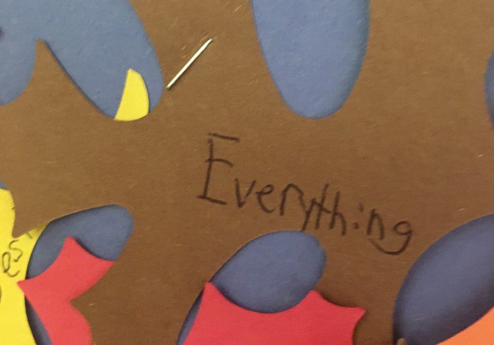 I explained the concept of being thankful by describing it as anything they would be sad without, something they love, or care about, anything that makes them happy. I know I could have been more elaborate, given such a loaded concept a more glamorous explanation, but I wanted them to understand in the most basic way. I was prepared to have answers such as “my Pokemon cards,” or “my stuffed animals,” because those were objects that made me happy when I was their age.