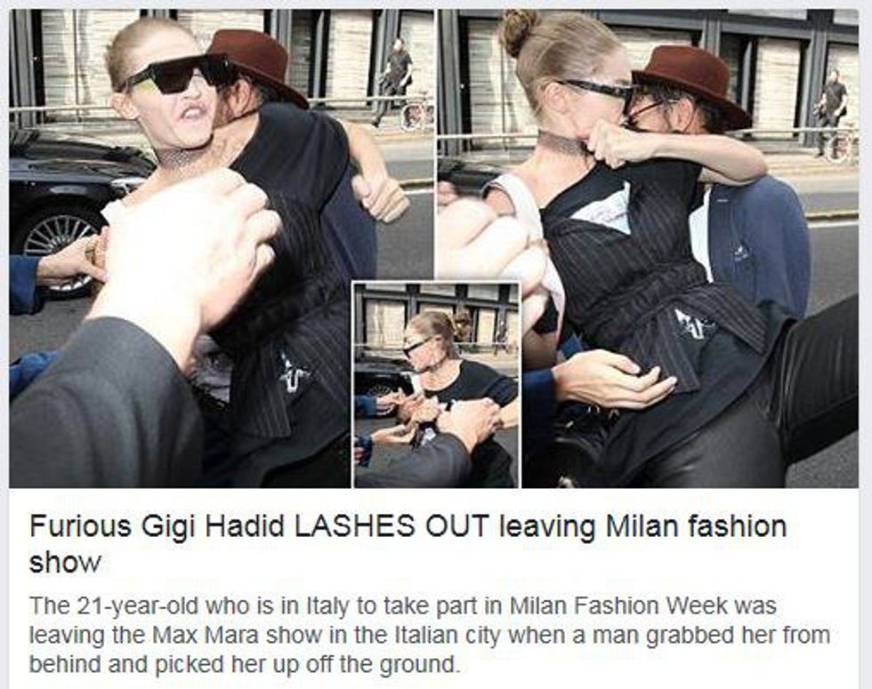 As I am sure most of you have seen already, Gigi Hadid was attacked while she was leaving the MaxMara fashion show in Milan, Italy. She was walking to her car with her sister and her bodyguards when a supposed prankster came from behind, picked up Hadid while she struggled in his grip. She elbowed him in the face and fended him off, telling him to “F**k off” and shouting “Who the f**k do you think you are?”