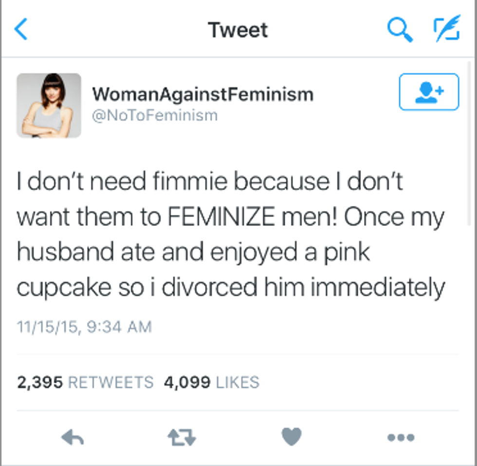 Feminism is the worst because I would never want a feminine boyfriend. Ew, he's not 100 percent masculine, get him away from me.