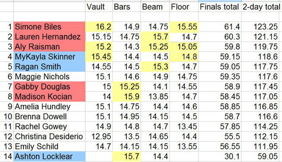 Gabby took seventh place after night two of the Olympic Trials. Team USA takes five gymnasts so if they were going off points Gabby should not be going, but they do not. Gabby is being taken to Rio solely for bars and that would mean she is a bars specialist yet Ashton Locklear who scored .45 higher than Gabby on bars is just an alternate. If the US wanted to take two bars specialists then they should've taken the top two bars scores especially since Gabby and Ashton's scores weren't even close.