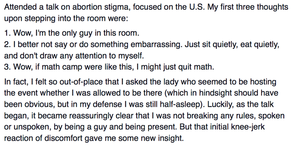 The other day, I stumbled upon an intriguing Facebook post by a friend — it was about his experience walking into a talk on abortion stigma and finding that he was the only man in the room: