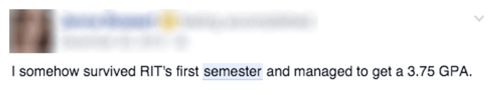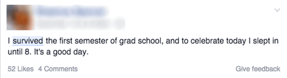 When students say they are surviving college, it implies that they are continuing to live in spite of hardships. Yes, as college students we go through hardships and struggle often to get assignments in on time, to get any sleep and to do well on tests, but getting good grades is not a life or death matter. Many of the students who share that they survived the semester on Facebook may not have gone through some of the serious challenges that many students do. Depression is common amongst college students and sometimes just feeling like one's life is worthwhile can be a daily struggle.
