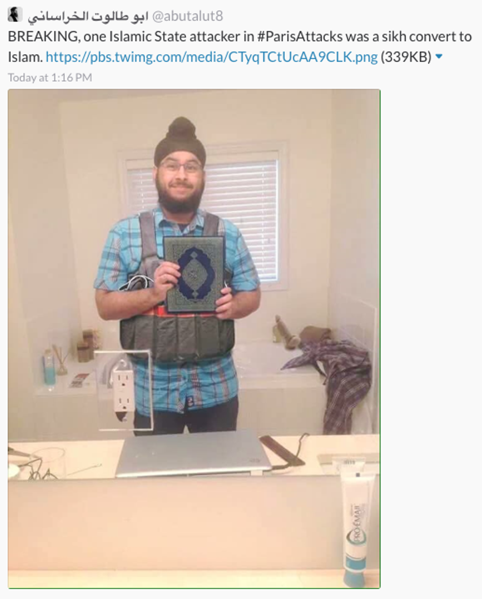 The above image is a photoshopped picture of Veerender Jubal, critic of GamerGate, who had a picture of him photoshopped to have the supposed Qur'an, dildo (really?), and suicide bomb vest in the image. It made him out to be an Islamic State member who participated in the Paris Attacks last month. It was actually a picture of him taking a selfie with a regular iPad, without the suicide bomb vest, Qur'an, and dildo (really, again?). Thankfully, this picture drew skepticism from social media users, who were able to debunk this myth.