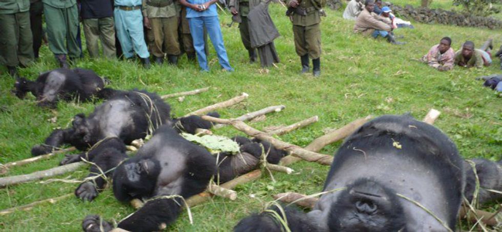 (Mountain gorillas [Gorilla beringei], believed to be poached purely as "scare tactics" toward park rangers in Virunga National Park, Democratic Republic of Congo. Source:Dailymail.co.uk)