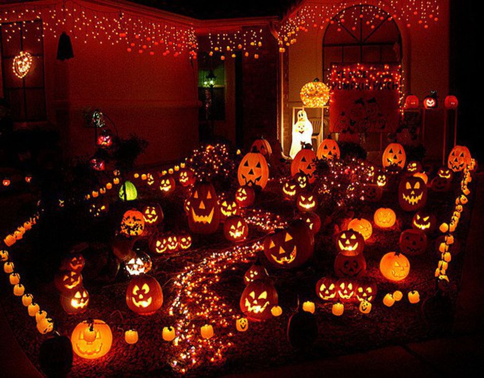 Your house doesn't need to be seen from outer space nor do you need to ward off any evil spirits. You're fine with just a few pumpkins on your doorstep and a nice little sign that says, "Boo!" Not to mention that looks like one hell of a fire hazard.