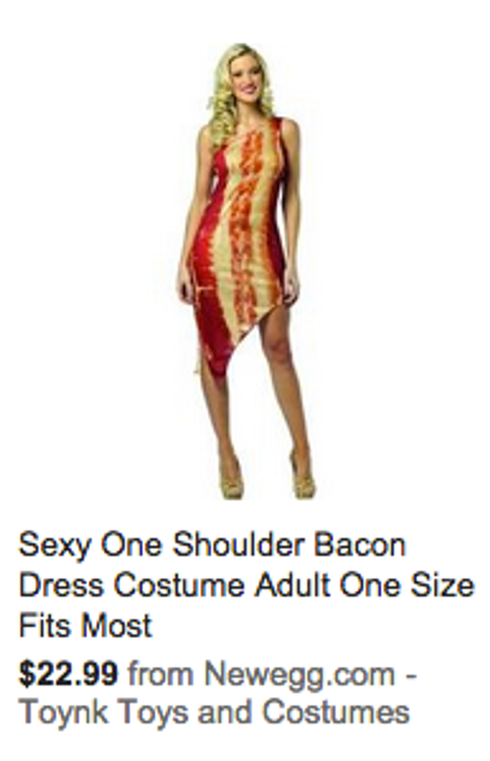 First of all, calling bacon sexy is like calling water wet. Everybody knows bacon is God's gift to mankind, even pigs understand it. What I don't understand, is why you would ever create a Halloween costume based off bacon or why any self respecting woman would want to tell her friends that she was "a sexy bacon for Halloween." I feel like vegetarians/vegans would definitely lose their shit over this costume, kind of like when a kid sees candy, but not as happy.