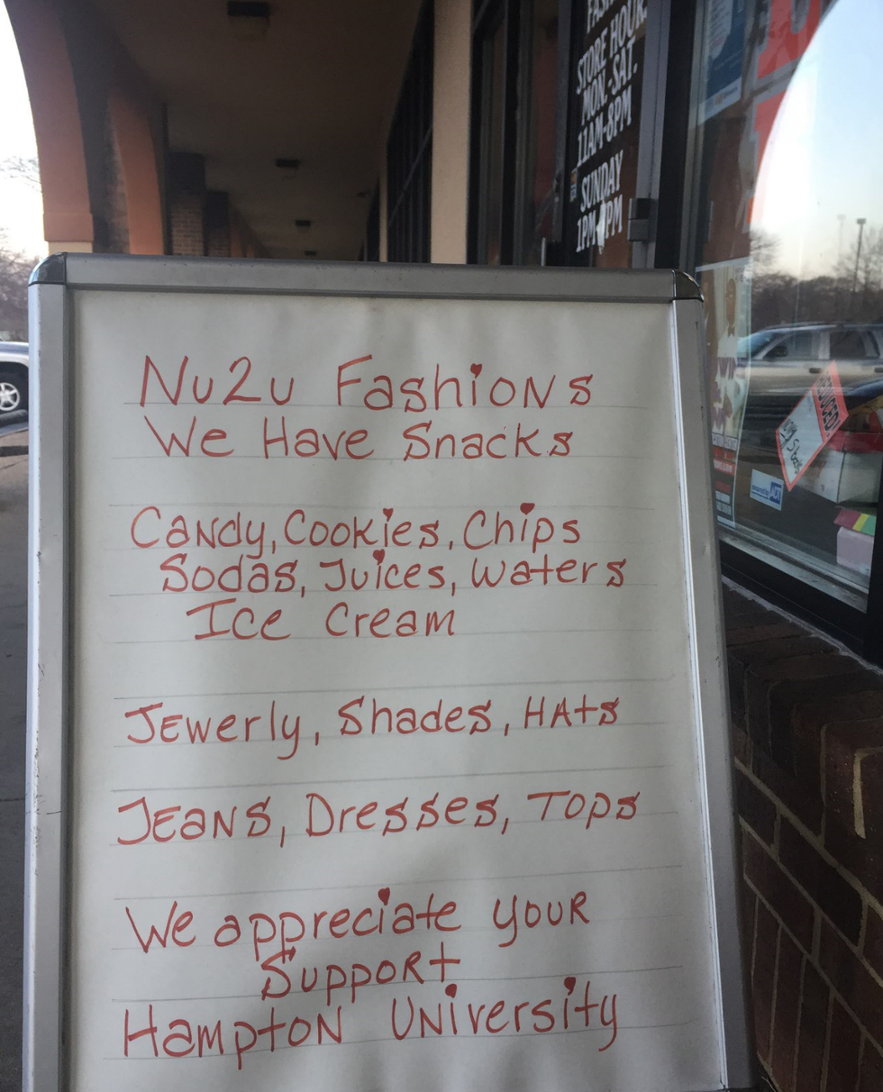 Ms. Regina Jones is a businesswoman and a mother figure that owns and operates NU 2 U. She understands the importance of black business and is proud to be in a location where she can serve a community that is predominantly populated by African Americans. A petition was started a few days ago and was signed by students, the community, and even some members of the university's faculty. Over 600 signatures have been recorded as of Sunday March 19. If you're a Hampton student and haven't had a chance to sign that petition, make sure to stop by the harbors soon to do so (1026 Settlers Landing Rd). The school has the ultimate say in the fate of NU 2 U, but do what you can right now to support a place that has provided what the area needs, again, convenience, great experiences, and support.