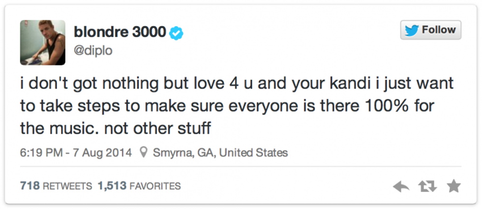 Surprisingly, I am not the only one that feels this way. Even some D.J.'s have taken steps to try to ensure that the audience is there simply for the music. Although banning "kandi" at one of his concerts made his fans extremely angry, Diplo decided to start a change in the audience at his shows.