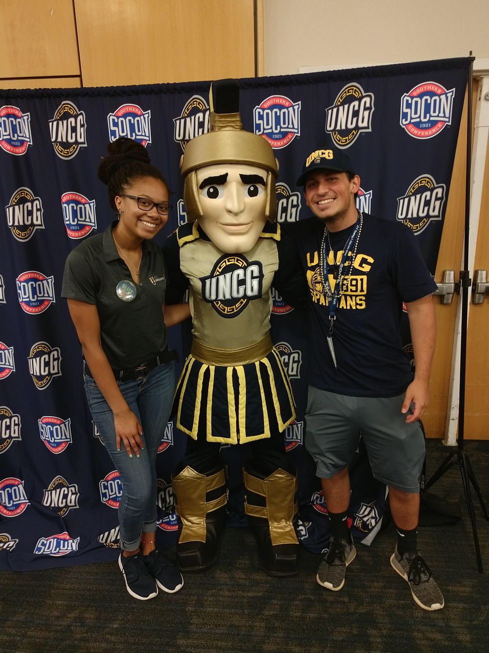 Me and my first student I interacted with in my first first year small group, Miguel, stopping to take a picture with Spiro, UNC Greensboro's Mascot.