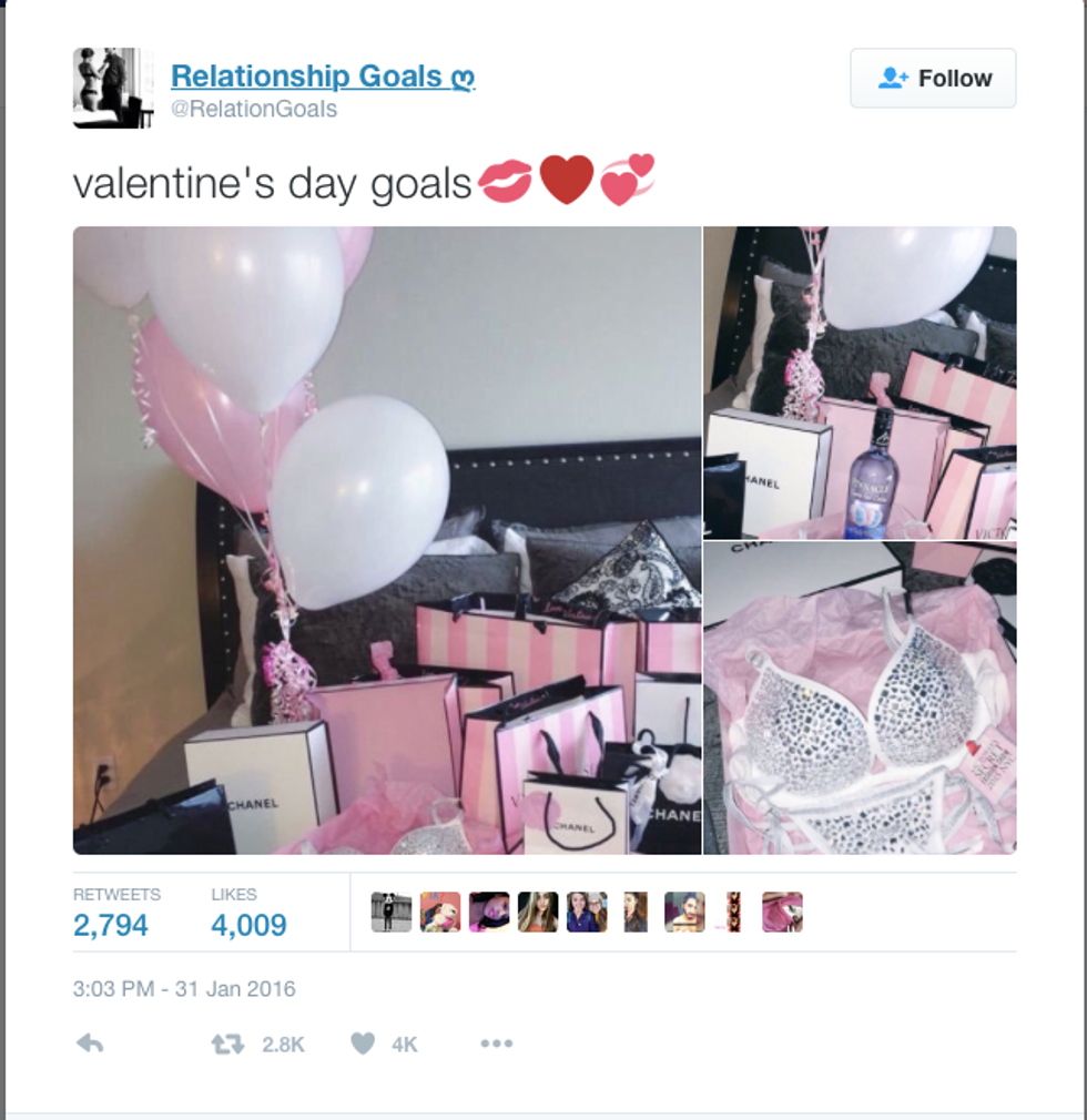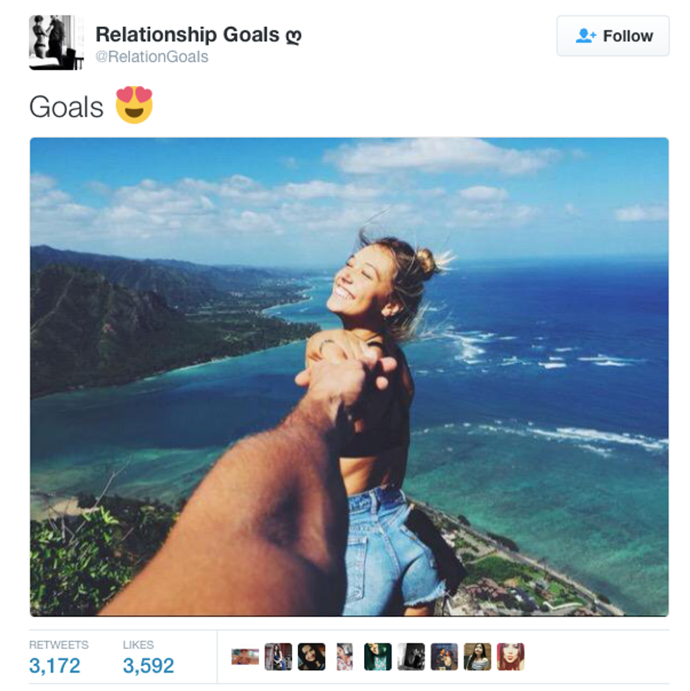 Logging onto Facebook, Twitter, or Instagram, photos of elaborate gifts or crazy vacations clog our newsfeed with the caption "relationship goals." We've all seen it, and we've probably all retweeted or shared a few. Today's relationships goals are based on two things: fiction and money. Wouldn't we all love to join our boyfriend, girlfriend, or spouse on a getaway to Santorini, Greece, or a private island in the Caribbean? Sure. Wouldn't we love a chance to go skydiving together, receive a huge diamond necklace "just because," or give that special someone front-row tickets to their favorite band? Absolutely. But, frankly, that's not what a true relationship is like for the average couple. These relationship goals are unattainable and they create expectations for a relationship that can never be met. Celebrity couples or star athletes and their significant others incite the same reaction. Certainly, their relationships must be special. But why is our generation so obsessed with these extravagant dates, presents, and stories of romance?