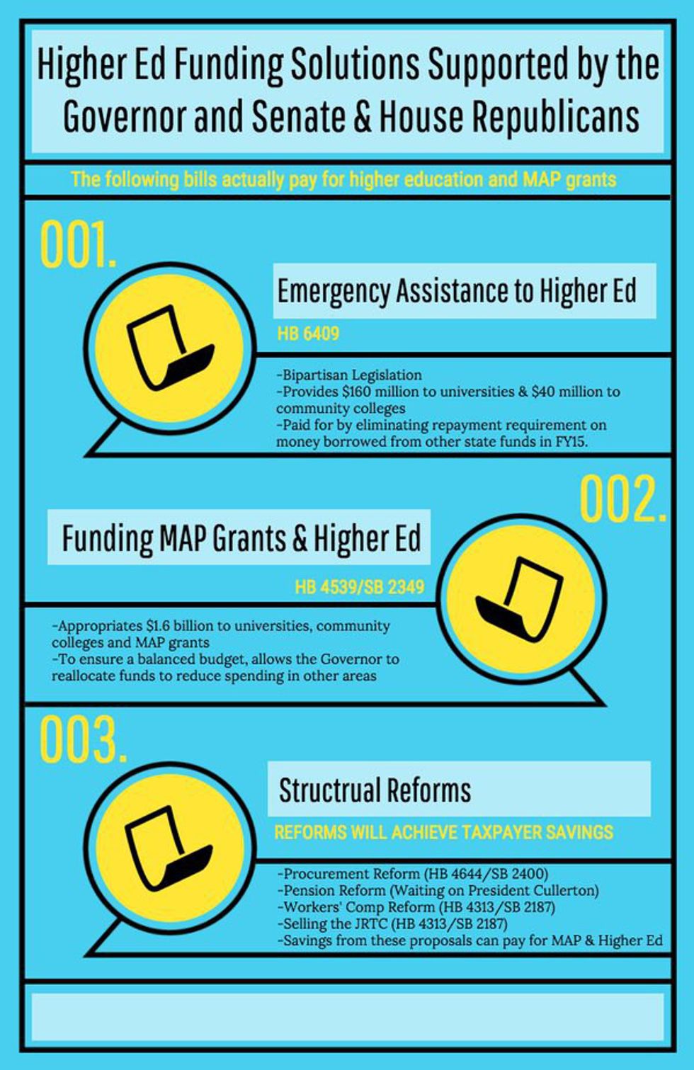 I also find it ironic that Rauner who claims to be greatly concerned with Illinois attracting residents and keeping residents in the state as taxpayers seems unconcerned with the fact that he is alienating an entire generation of young voters and tax payers (not to mention their families). Governor Rauner tweeted recently that he "supports funding higher ed and MAP grants, but we need to find a way to pay for them." (@GovRauner, March 17, 2016). Attached to his claim of "supporting the funding of higher education and MAP grants" was an info-graph showing his plans for how to solve the Illinois budget crisis. If you look under the section for MAP grants, you will see "to ensure a balanced budget, allow the Governor to reallocate funds to reduce spending in other areas."