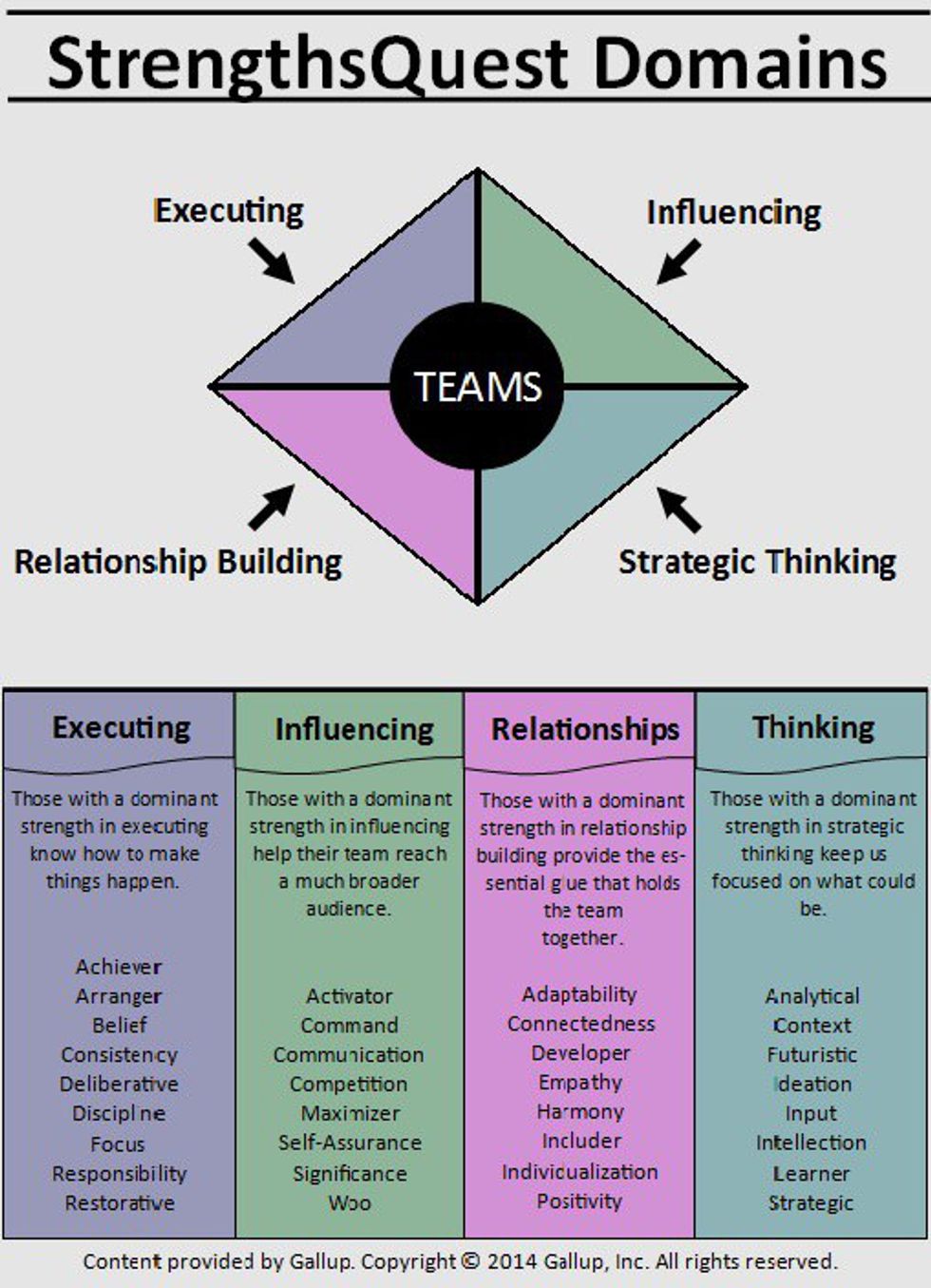 Knowing where your strengths lie allow you to know where you best fit in a team or group setting, as well as how you work as an individual. While we all want to say we are strong in all these areas, it is just not realistic. Even if you have a strength in each of the four domains, you are no expert on all four areas.