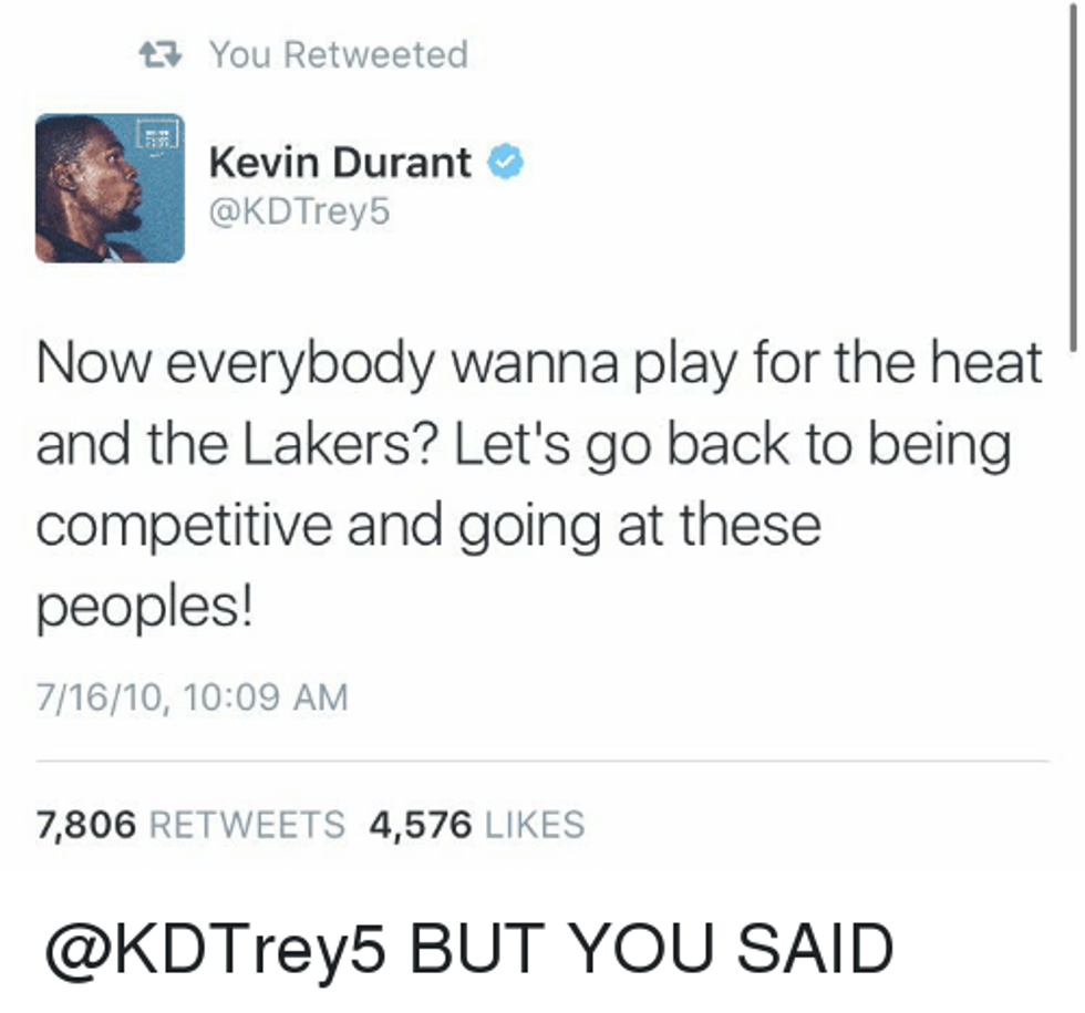 Yet it all comes back to winning, like Pau Gasol said. Kevin Durant is, in my opinion, the most underrated superstar of all time. He has the third highest average of points per game in the history of the National Basketball Association at 27.4 PPG. He has won only one MVP award, but has finished second in the voting three times, a defeat that he has publicly stated is a major annoyance. He lost in the 2012 NBA Finals to LeBron James and his flashy Miami Heat squad and hasn't returned to the Finals since. For a perennial superstar who has been named to the All-NBA First Team five times and won the NBA scoring title four times, it is about damn time he wins a championship.The Golden State Warriors clearly presented the most advantageous road for Durant. He just wants to win; once you have dominated the league to that extent for so many years, nothing else really matters. Durant is 27 years old with a $120 million dollar net worth. Money isn't an issue. And he doesn't seem to have an issue abandoning those who depend on him. Durant quoted in a 2015 interview following a broken engagement with WNBA player Monica Wright, "I had a fiancée but... I really didn't know how to, like, love her, you know what I'm saying? We just went our separate ways."