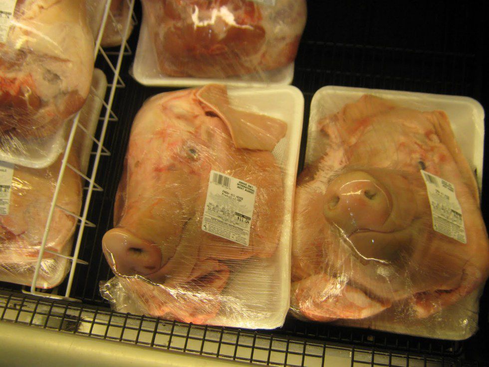 Yep. That is a pig's head. They also have python filets, ground kangaroo meat, and jerky of many animals.