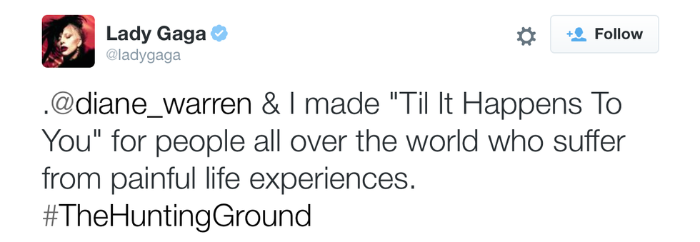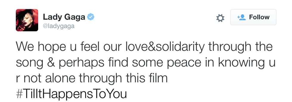 Lady Gaga's newest video has everyone talking. Written for "The Hunting Ground," a documentary about sexual abuse on college campuses, Gaga and co-writer Diane Warren's "Til It Happens To You" was written to connect with those who have been through "painful life experiences." Not only focusing on the savage-like acts of sexual predators, Gaga and Warren also portray the grave aftermaths faced by the victims. The loss of self-worth, denial, and isolation are only a few of the symptoms experienced by survivors depicted in the music video. But, there is some light at the end of the tunnel -- the very end of the video shows the victims surrounded by love, support, and encouragement, which empowers them to open up and move beyond the experience.
