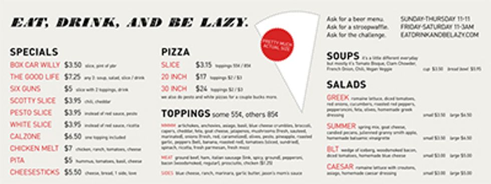 That’s when I saw on the menu, nestled between a minimalistic-design list of oddly named specials and cheap cheap cheap pricing, the triangle outline of the slice-o-meter. Easily the length of the top of my head to my chest, a snarky PRETTY MUCH ACTUAL SIZE was smacked on top of the outline, and I realized I was probably about to revolutionize my usual order of two slices, one sprite.
