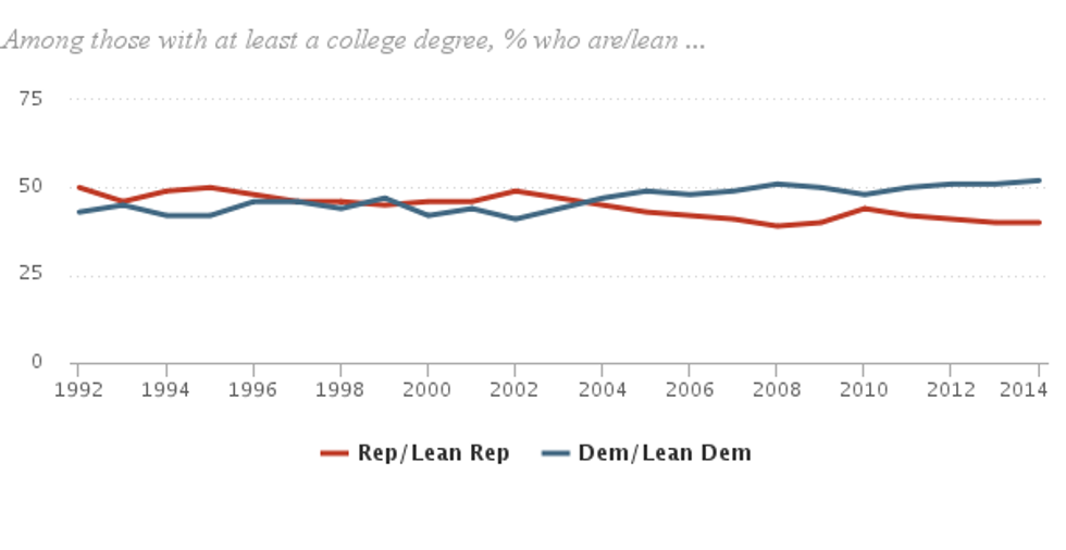 Since the publication of a previous, more detailed report by the Pew from 20052, data has supported a correlation between education level and Democratic Party affiliation in America. According to the more recent 2014 data, 52% of those with a college degree lean towards Democrat, versus 40% towards Republicans. However, low income also has a strong correlation with Democratic Party affiliation: 54% of respondents earning below $30,000 lean towards Democrats. This was interesting because data shows that in recent years, the vast majority (80%) of high-school graduates who enrolled in college came from high-income households3. I wondered if there was some common factor that was tying the two groups together in favor of Democrats.