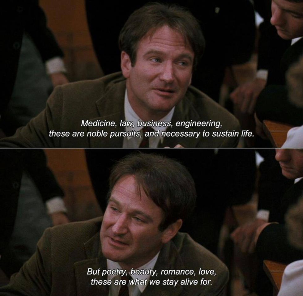 Which brings me to the point of poetry. I, personally, love to read and occasionally attempt to write poetry because for so few words there is so much to be talked about. Poetry is one of the hardest things to write, but if done right, is one of the best things to read. My favorite part of poetry is that there can be so many different interpretations that make the dialogue unique to the reader, which is also true of literature but especially poetry. Poetry has the power to move in the vaguest sense, and is one of the reasons that I couldn’t live without studying English.