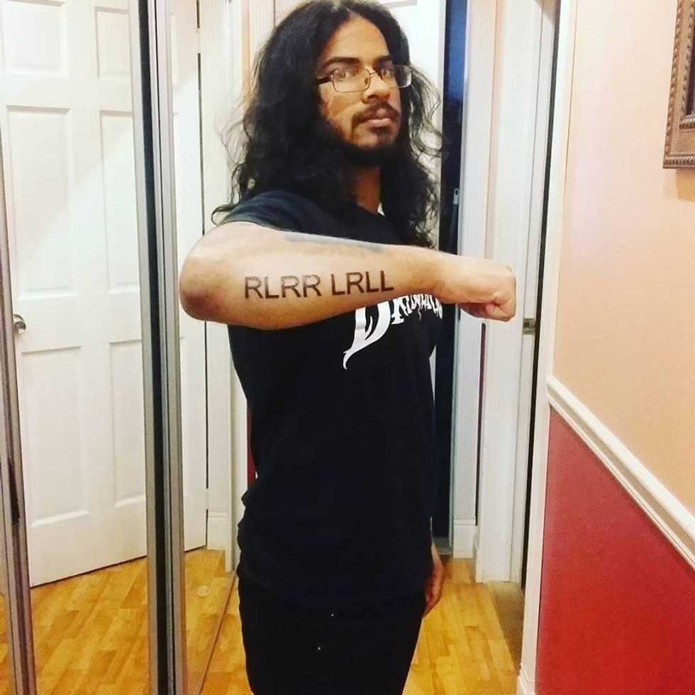 My third tattoo was one I got myself for my 19th birthday. I got money from relatives and dug up another $100 out of my savings and got myself a very relevant tattoo. I'm the drummer for a local band, which I care about very much, Toxic Crew. And playing drums has always been a musical endeavor I was interested in, but never had a chance to pursue. So with this opportunity, I've very much cemented myself as a drummer and decided to get a tattoo that fit that part of my identity. So my third tattoo was a paradiddle (RLRR LRLL), one of the basic drum rudiments. Rudiments are to phrases as words are to sentences; they're the building blocks for the language of drummers.