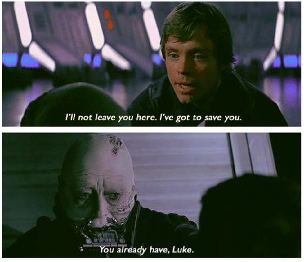 One of the best things about the film is seeing the results of Luke’s character development. He's no longer the whiny farmboy from A New Hope, nor the emotionally-irrational padawan from The Empire Strikes Back. Instead, we’re given a calm, collected, intelligent and highly skilled Jedi Knight. He's basically the epitome of a badass. But what really made me love him is that despite how “cool” he was, he still displayed an unwavering sense of kindness and compassion. His lightsaber may be a powerful weapon, but it's no match for his words. Vader spent years thinking that there wasn't any good in him left; that he was just a shell of who Anakin Skywalker used to be. But Luke’s words were so strong that they were able to remind him of who he truly is and bring him back to the light.