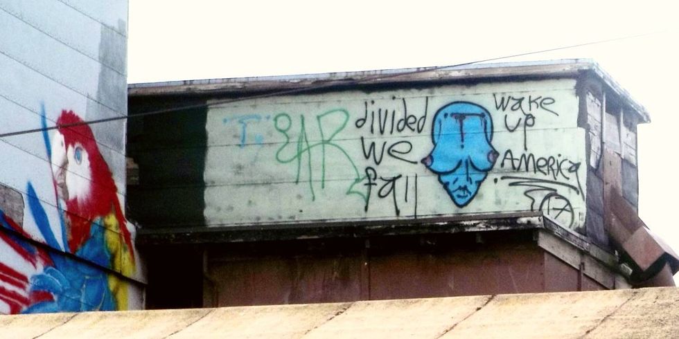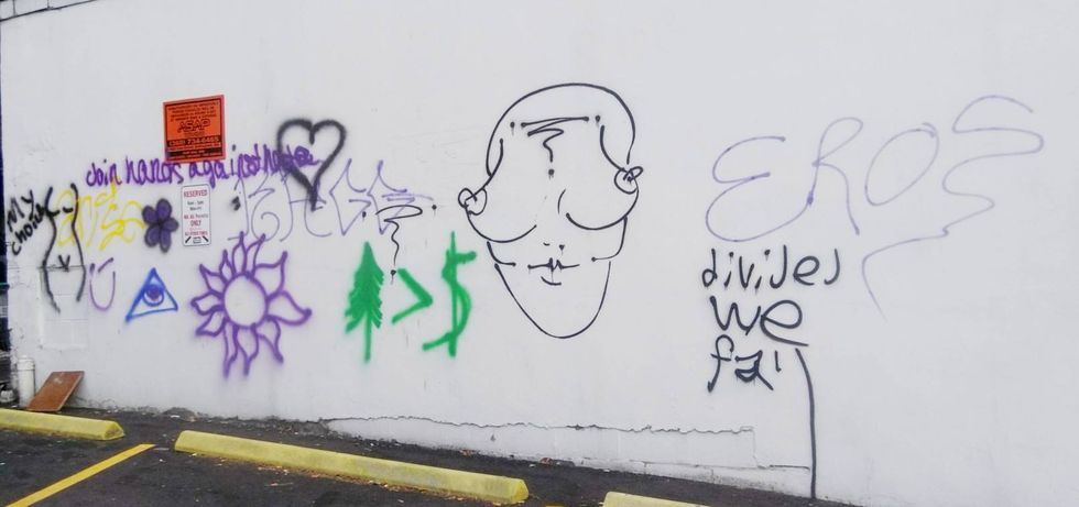 Secondly, the whole point of graffiti is to be controversial. Taggers take public space and illegally spread their message without permission. And the Titty-Face Tagger defines controversy in every aspect of their design and placement. Most notably, the Titty-Face tags often appear with a quote next to it stating “divided we fall” or “wake up, America.” The Titty-Face Tagger seems to have a major commentary on the growing division within our country. And they express that opinion by making sure the message gets seen.