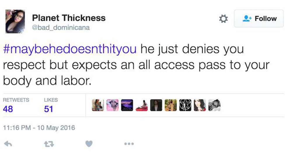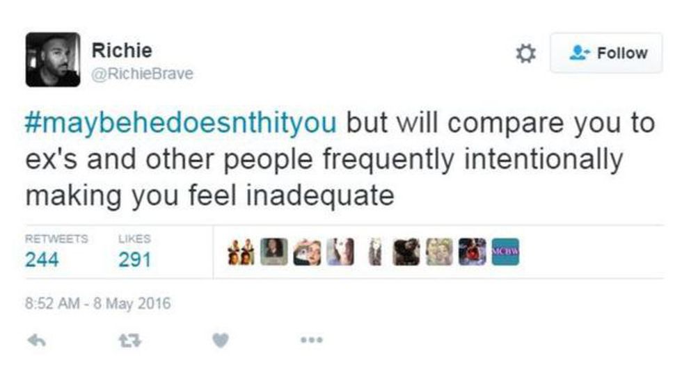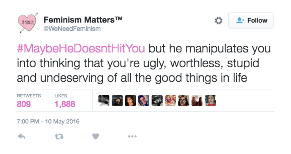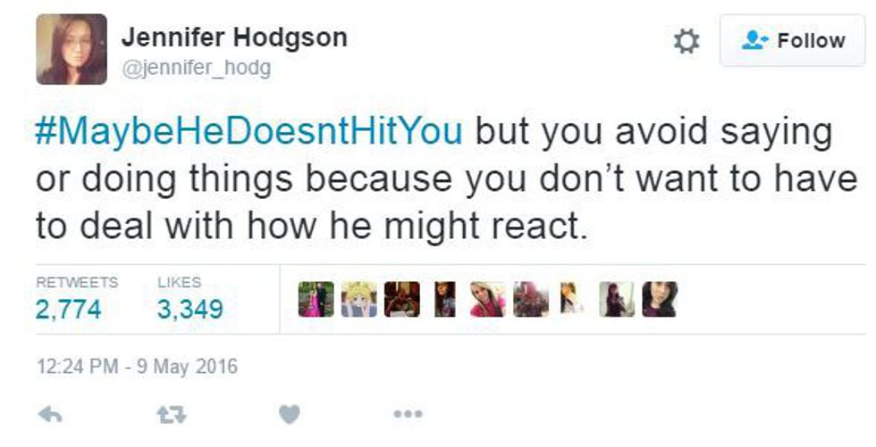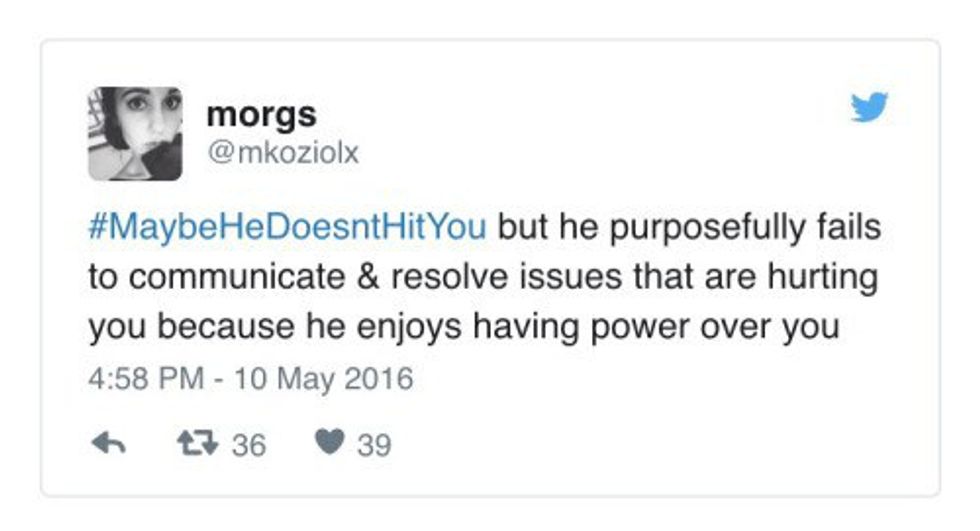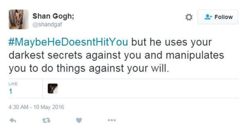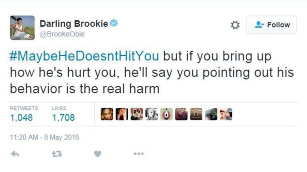 #MaybeHeDoesn'tHitYou made its debut in early May and immediately caught on. Women and men alike came out of the shadows to tell their stories. Through the hashtag followed by a small blurb, people around the world could shine some light on the domestic injustices that so many people experience but never think twice about being considered real abuse. Most people would only think of the stereotypical "man beating his wife" abuse, and not think of the emotional abuse many go through. Below are some of the tweets featured.