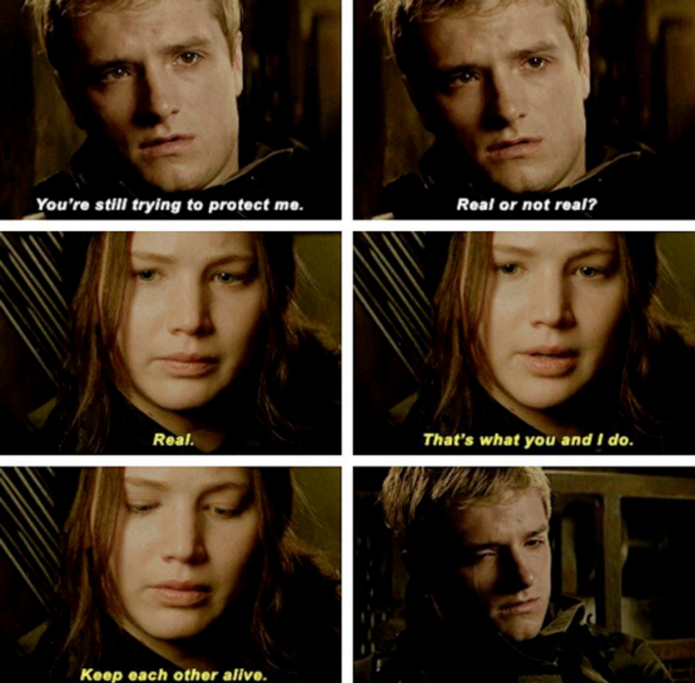 “Real. That’s what you and I do. Keep each other alive.” Peeta is so good and kind and he loves Katniss so much. This poor boy deserves so much better than to have all his memories of the girl he loves tainted with fear. It breaks our heart to watch him struggle against his own mind. We’re here for you Peeta.
