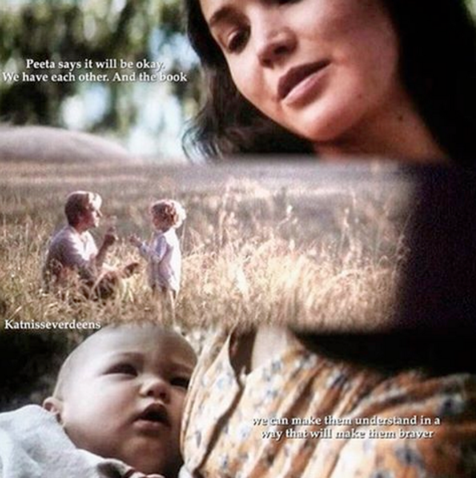 A sunny meadow. A laughing child. A baby in her arms. Peeta, smiling in the golden light. What should be such a happy end scene leaves us with all the feels. Katniss endured so much loss and detestation to get here, and she tells the child in her arms how she continues to survive, “That’s when I make a list in my head of every act of goodness I’ve seen someone do. It’s like a game. Repetitive. Even a little tedious after more than twenty years. But there are much worse games to play.” We’re so happy she got some form of a happily ever after, but it’s all so bittersweet.