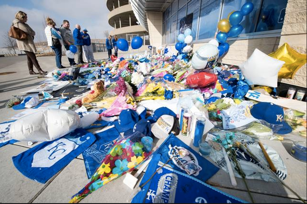 With the nation's eye on us, we mourned. On Sunday, fans gathered at Kauffman stadium to create a memorial for Ventura. Candles, posters, hats, baseballs and more were placed in honor of the young star. Royals players Danny Duffy and Christian Colon visited the memorial and received hugs from many fans offering their condolences for the loss.