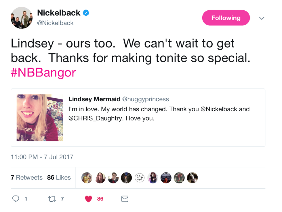 I'm somebody that reads about stories of fans meeting musicians. Based on fan stories, Nickelback is known for being kind to their fans, unlikely to reject autographs or pictures. They're also known to laugh and talk with fans, and even meeting fans through charity events. I've never met Nickelback, but I've always dreamed of it, especially meeting Chad Kroeger. Until that day comes, I will continue to admire them from afar...and I'll use this response from Nickelback to hold me over. I will fangirl over this tweet forever.