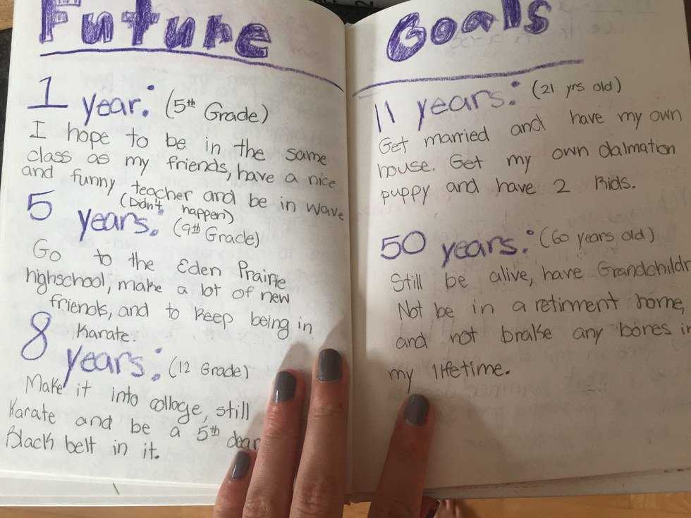 I was recently going through a box of old trinkets when I stumbled upon a book I had created in elementary school. As I flipped through the pages, ready to toss the book away, a page labeled “Future” caught my eye. There, scribbled out in my diligent but less than perfect fourth grade handwriting, were goals that I wanted to reach in five, 11, and 50 years. As I skimmed through the goals, my eyes landed hard on the ones I had set for 11 years in the future (when I would be 21 years old). They read the following: