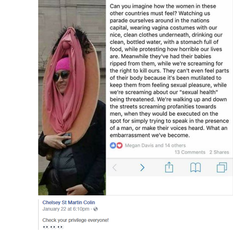 The post reads: "Can you imagine how the women in these other countries must feel? Watching us parade ourselves around in the nations capital, wearing vagina costumes with our nice, clean clothes underneath, drinking our clean, bottled water, with a stomach full of food, while protesting how horrible our lives are. Meanwhile they've had their babies ripped from them, while we are screaming for the right to kill ours. They can't even feel parts of their body because it's been mutilated to keep them from feeling sexual pleasure, while we're screaming about our 'sexual health' being threatened. We're walking up and down the streets screaming profanities towards men, when they would be executed on the spot for simply trying to speak in the presence of a man, or make their voices heard, what an embarrassment we've become."