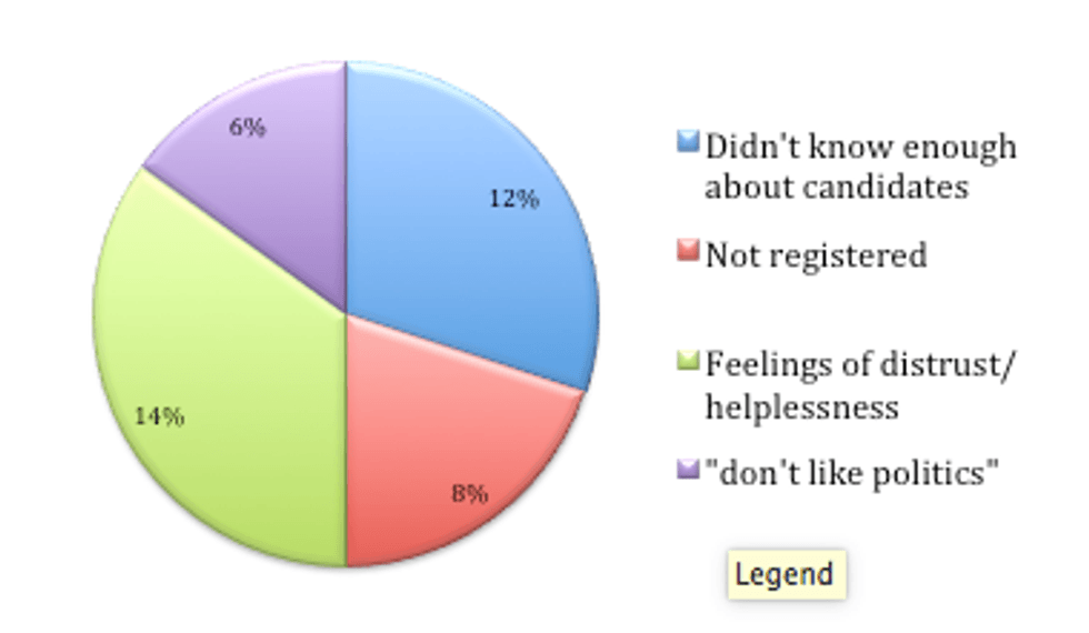 In a Harvard University Institute of Politics Survey conducted in fall of 2014, 80 percent of millennials responded that they were not politically active. When asked the reason, 23 percent declined to answer. Those who did answer listed the following reasons:
