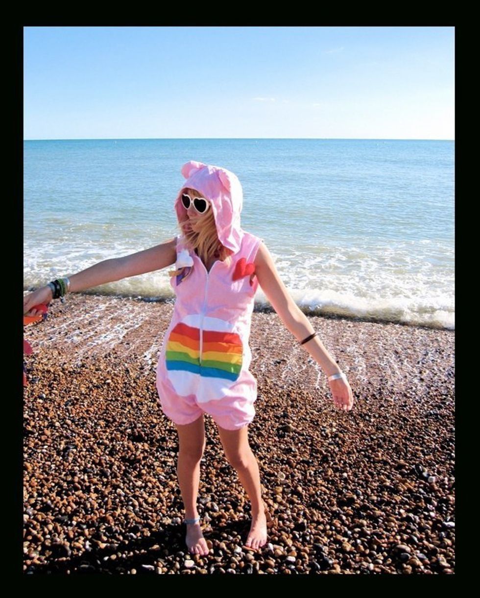 Rompers really aren't ideal for anytime but if you must wear one it will probably be during the hottest months of the year. Onesies however are versatile and come in many variations that allow you to wear them through the Fall and Winter and even in the Spring and Summer. Like this care bear inspired onesie pictured above.