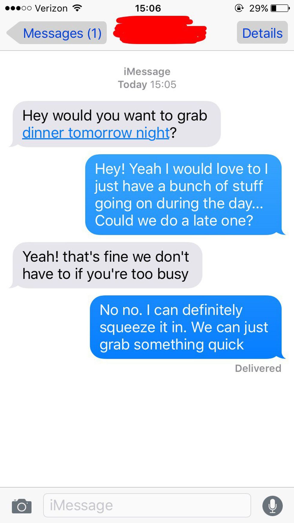 Reasoning: My time is valuable. No more so than anyone else's, but I'd just like to put that out there. I'm a college girl who is either working, learning, partying, studying or doing absolutely nothing. Pure value, right? It is so easy for anyone to set aside a quick hour period in the day to have dinner with someone. You can easily come up with a time conflict either before or after the dinner date to keep it short, sweet, and pretty much irrelevant because it's right in the middle of your plans. Here's an example of a real text exchange that I've had regarding a dinner date with some guy who may even be reading this.