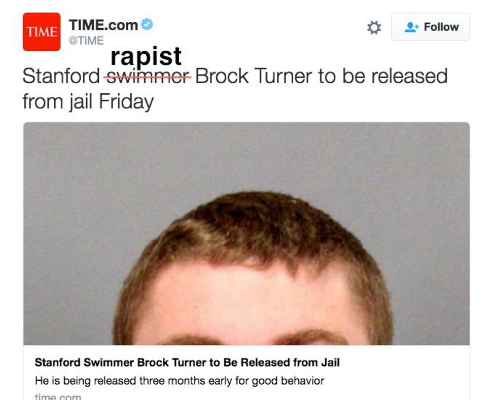 Now I know, I know, Brock Turner is old news. Everyone knows about what he did, and how he was sentenced a measly 6 months for his caught-in-the-act rape. By now we also know that he only was required to serve 3 of those months because he was released on "good behavior". Wow. I sure am glad he was well behaved in jail because out of jail he clearly doesn't know how to behave--or respect women for that matter.
