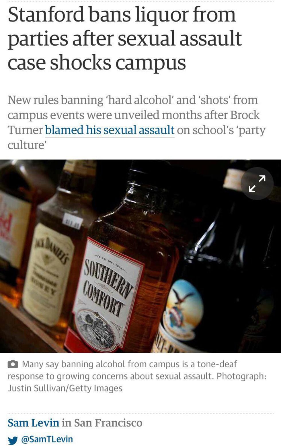 Raise your hand if you've ever had hard liquor and somehow magically refrained from raping someone. #RapeCulture is blaming alcohol for the rape that occurs on campuses rather than blaming the rapists. Was this really the only solution Stanford had for preventing rape? By banning hard liquor at parties Stanford is suggesting they agree with Brock Turner's statement that the 'party culture' and 'shots' are what made him rape a 23-year-old unconscious woman.